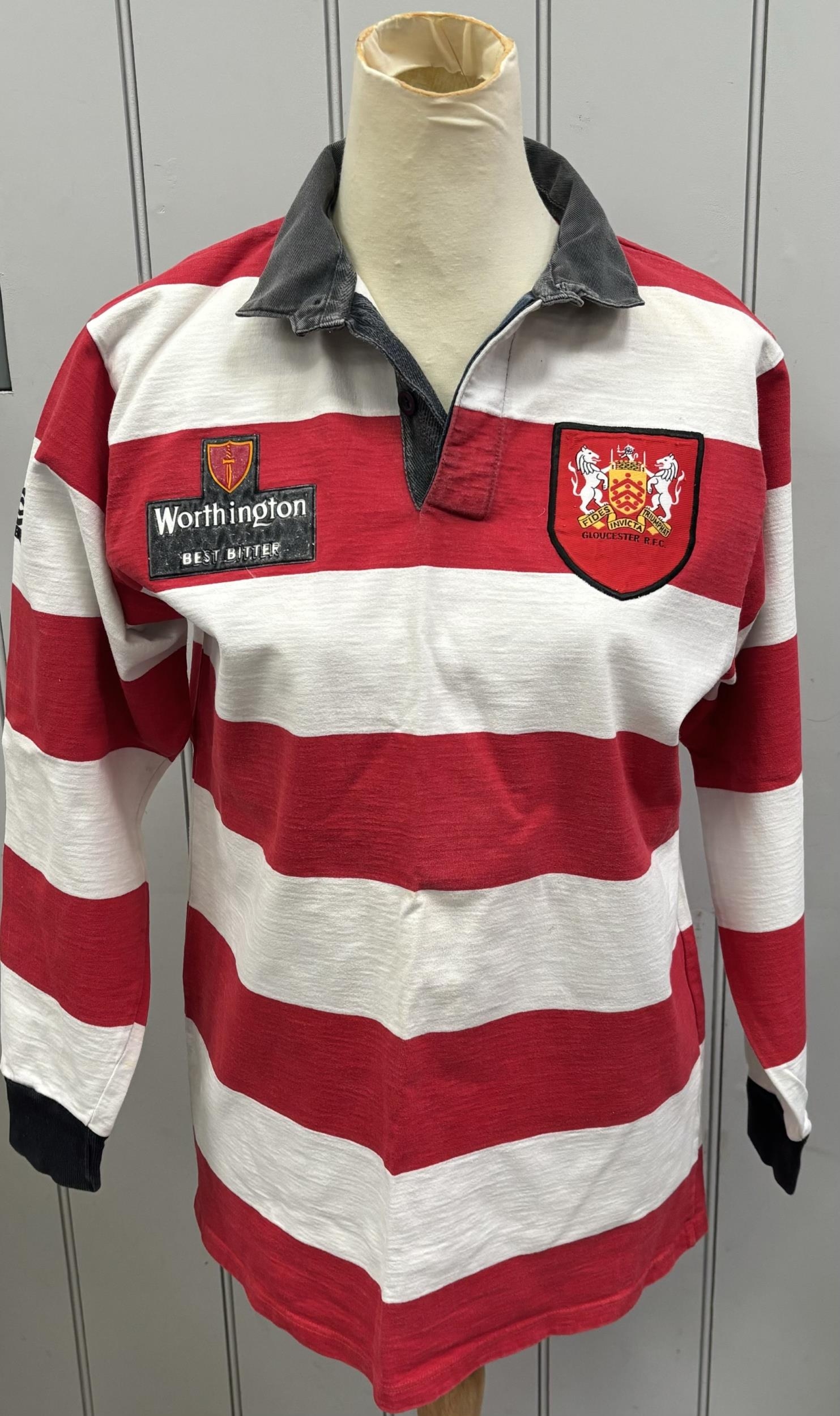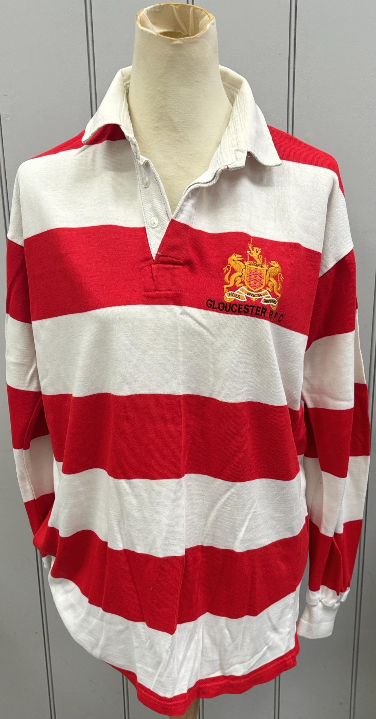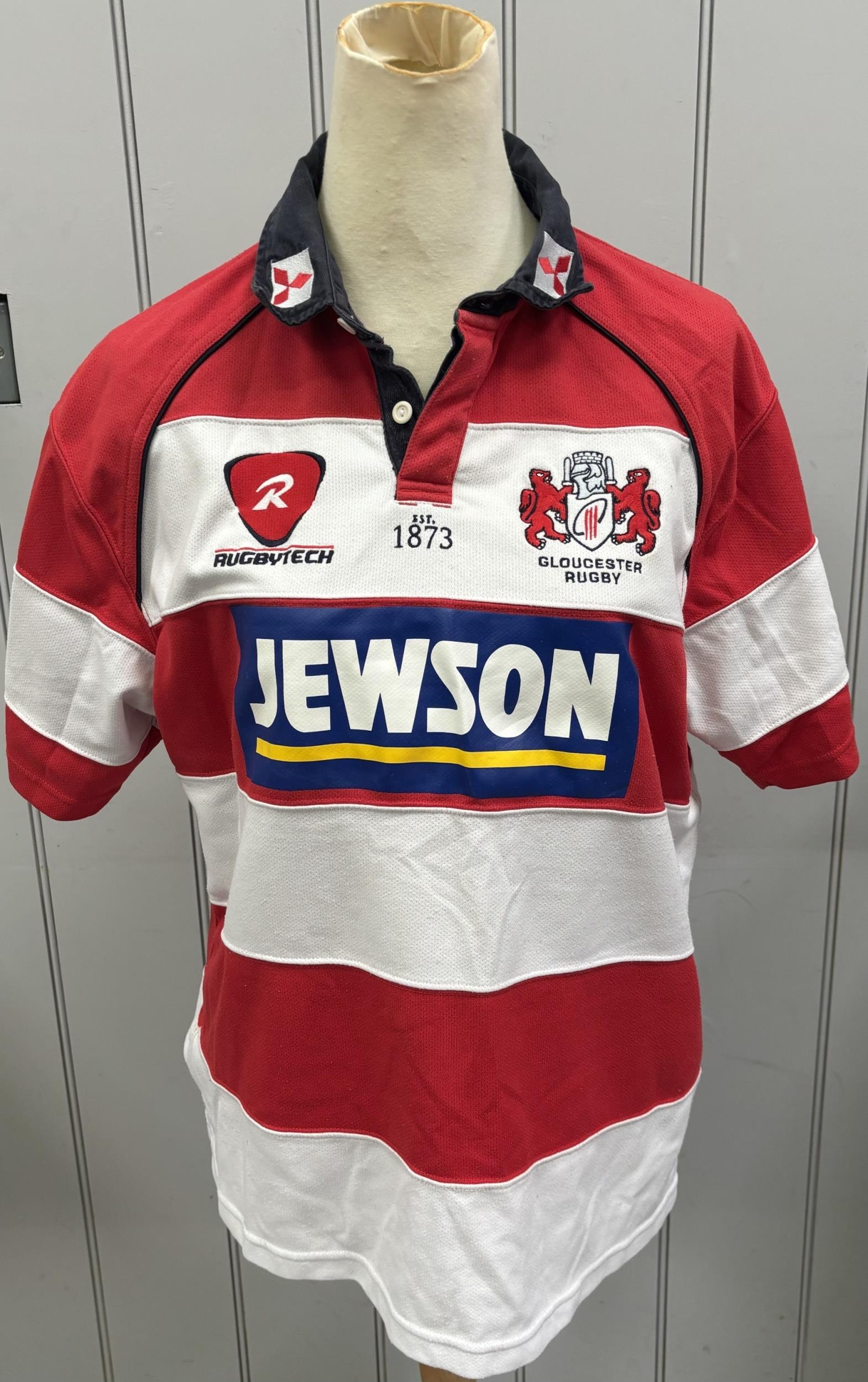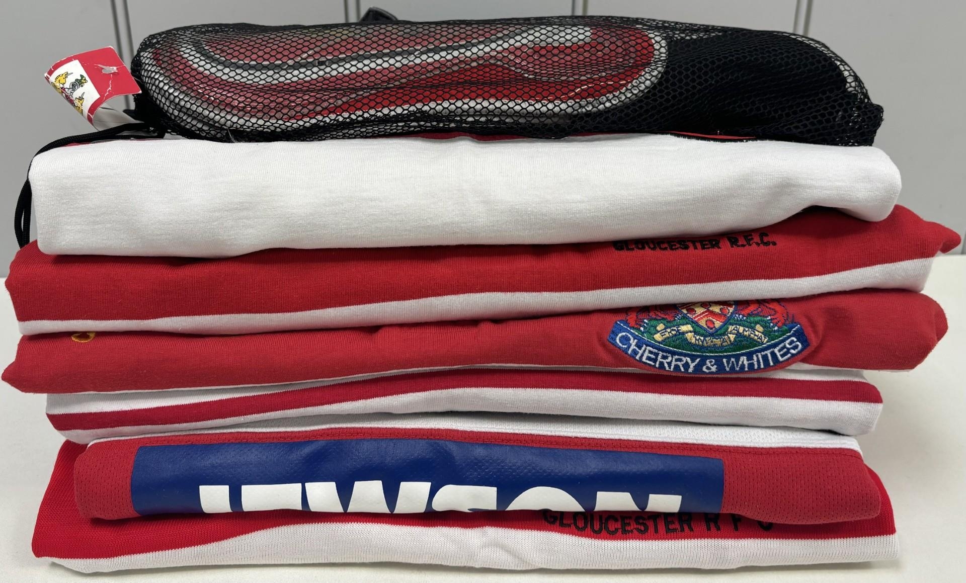 Six Gloucester RFC shirts, together with a pair of Bristol City FC shin pads.