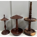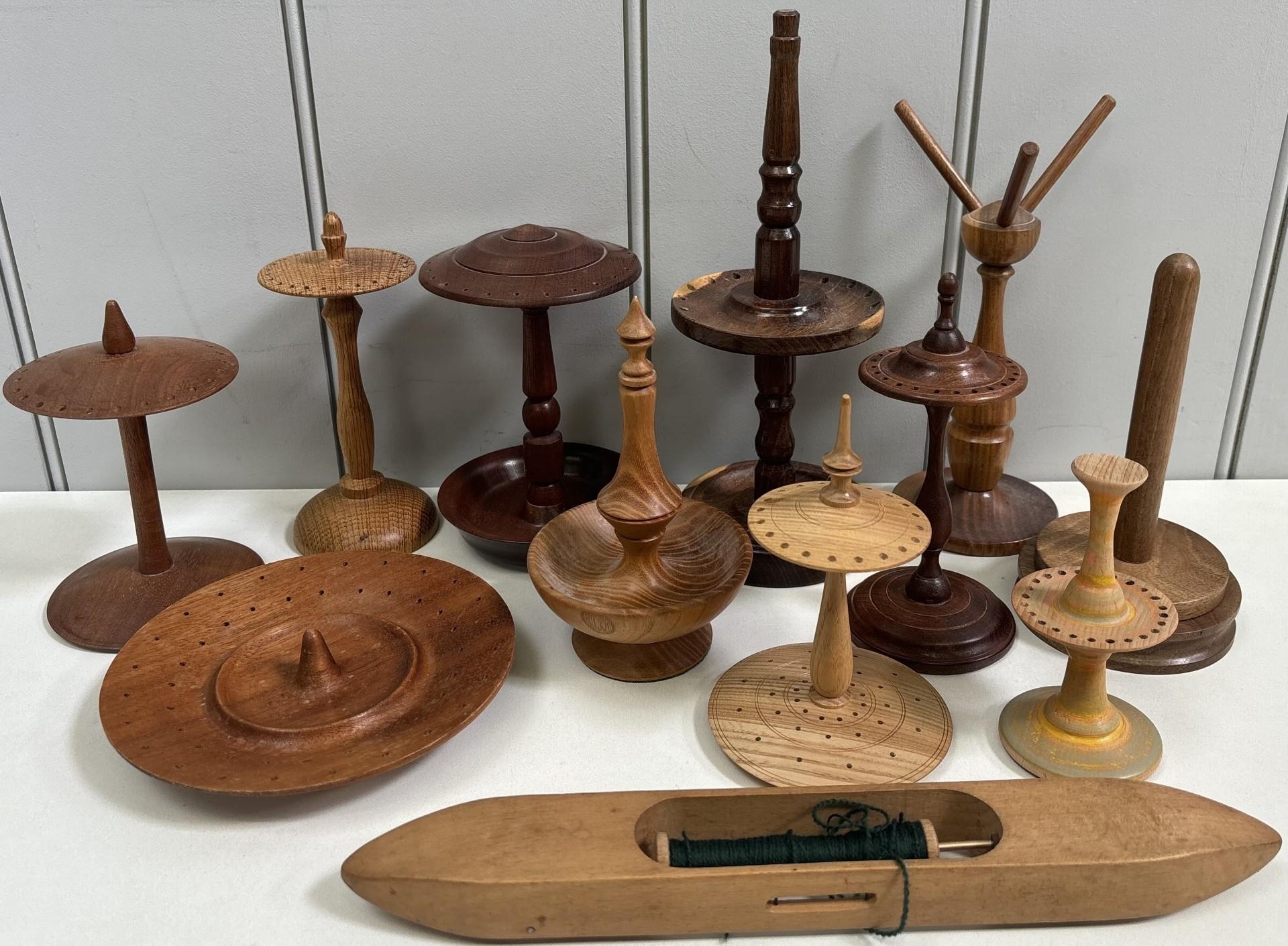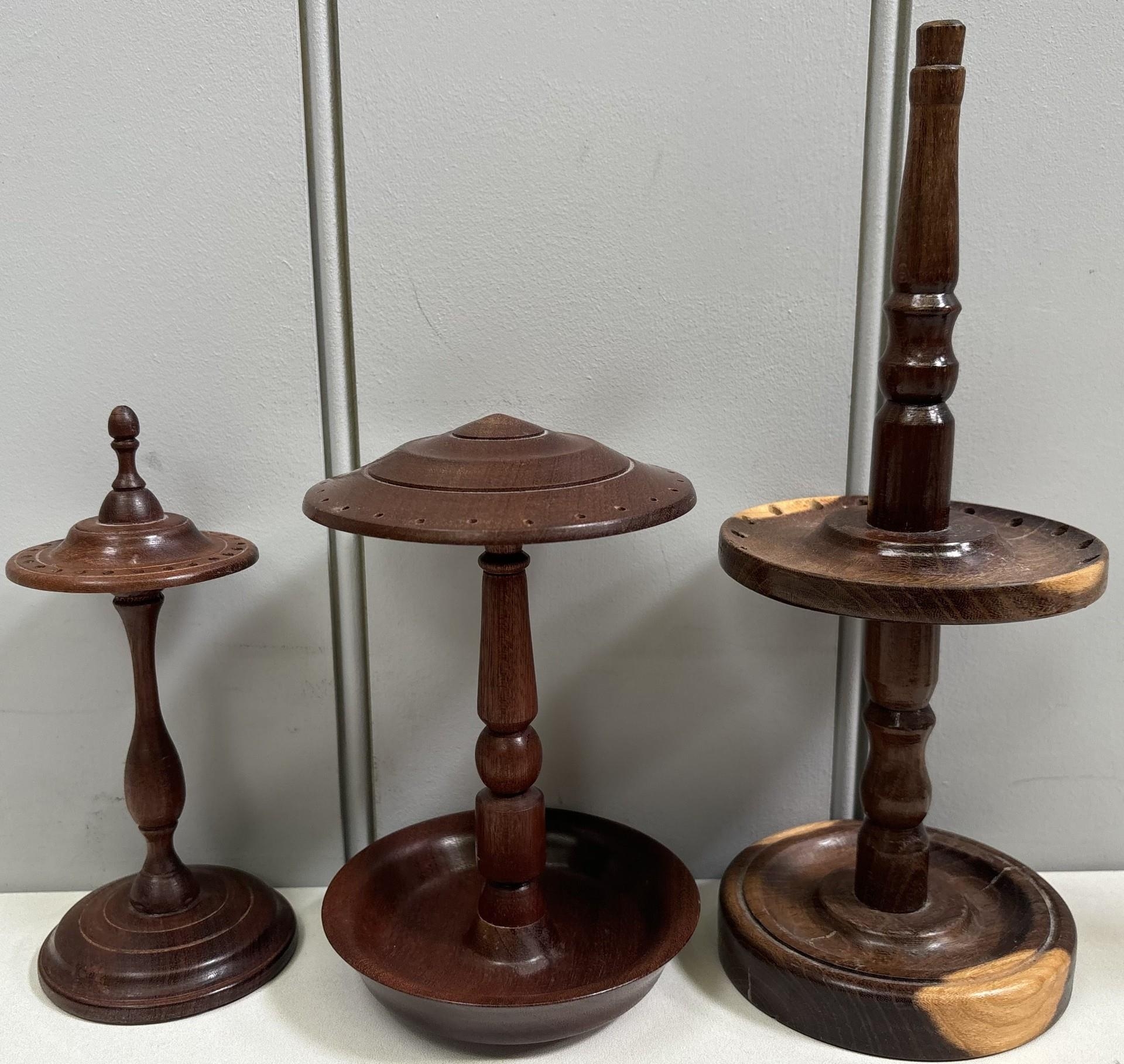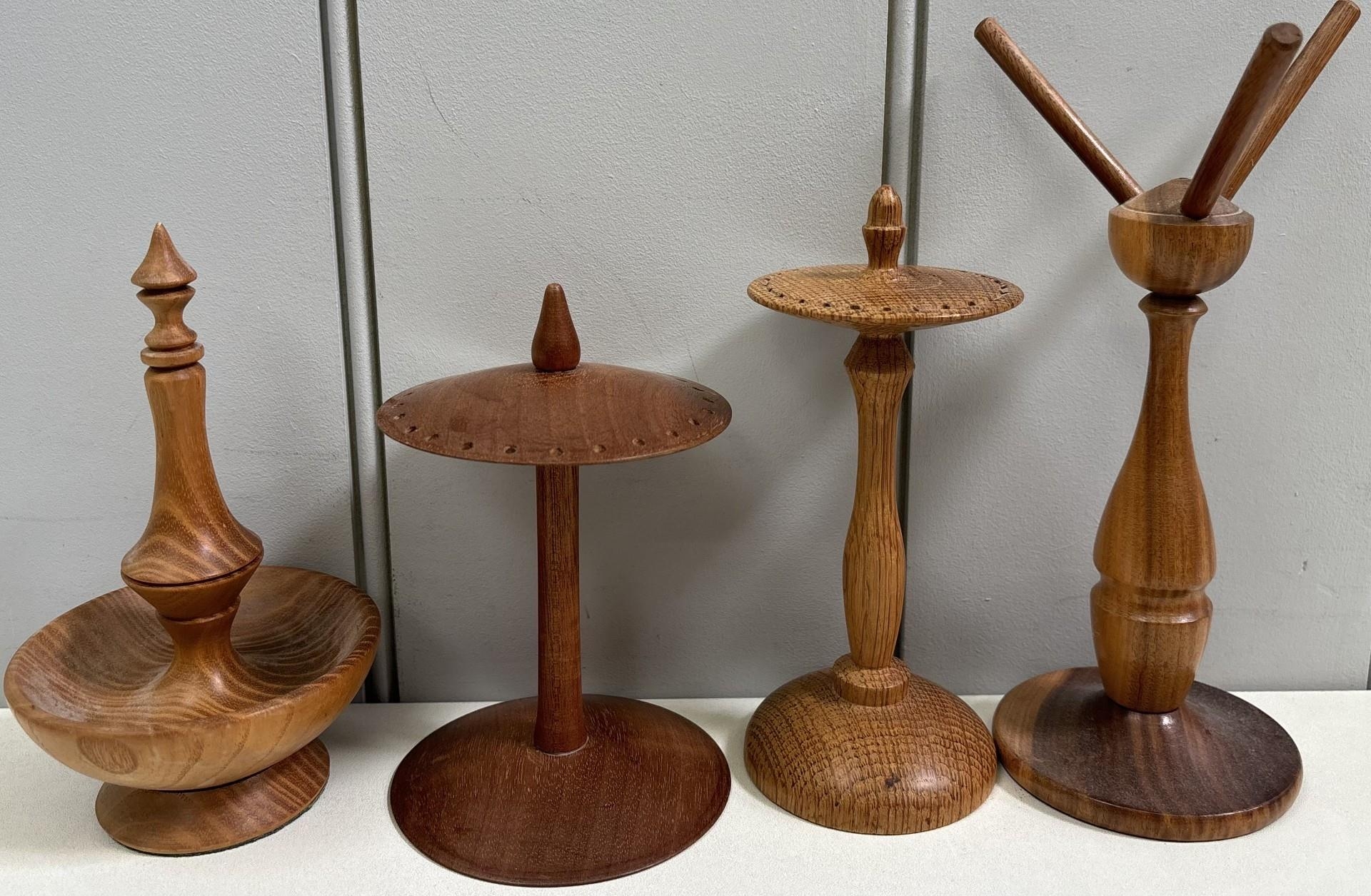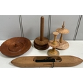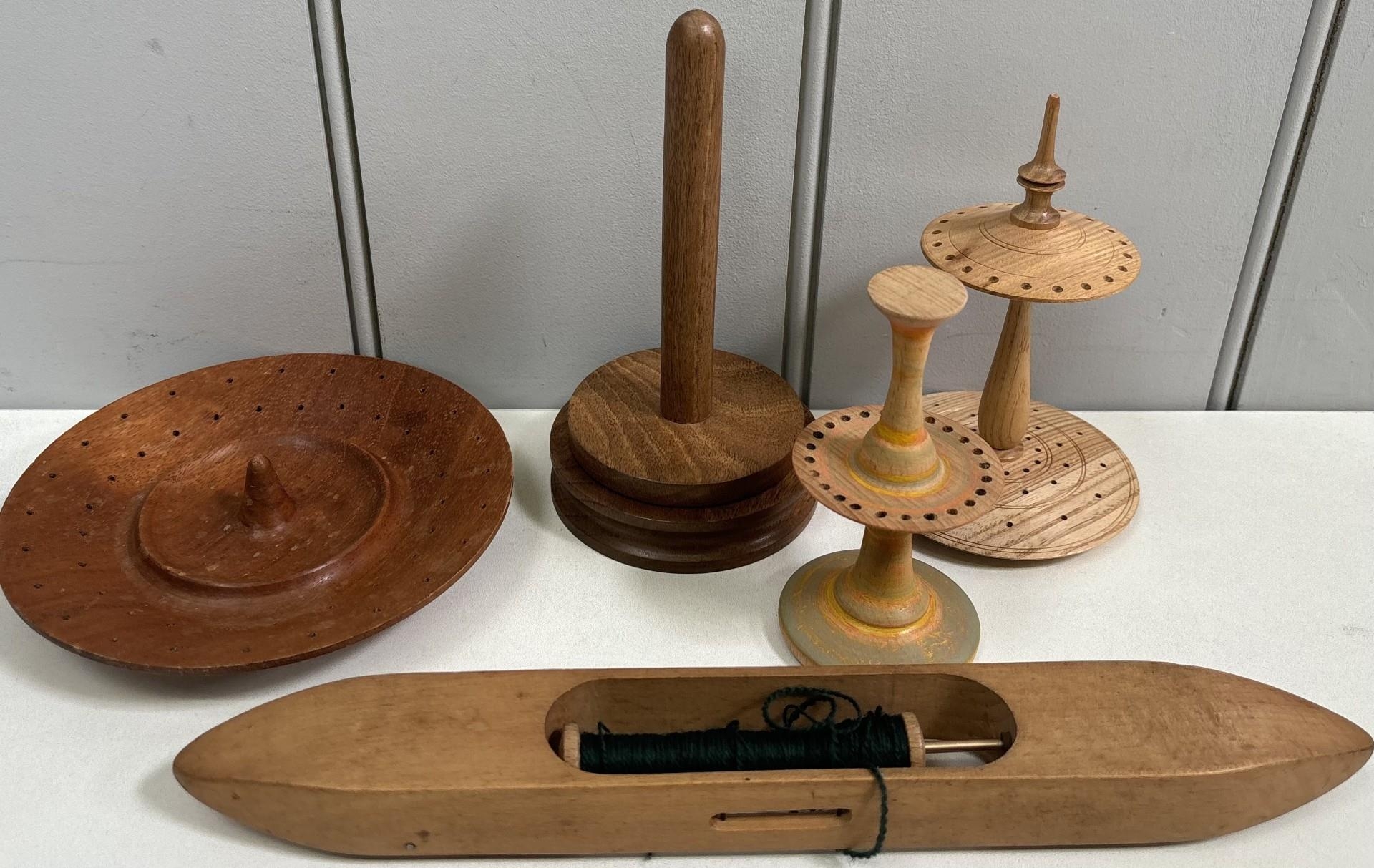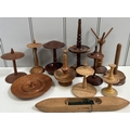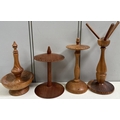 Collection of turned stands & shuttle. Majority being earring display stands.